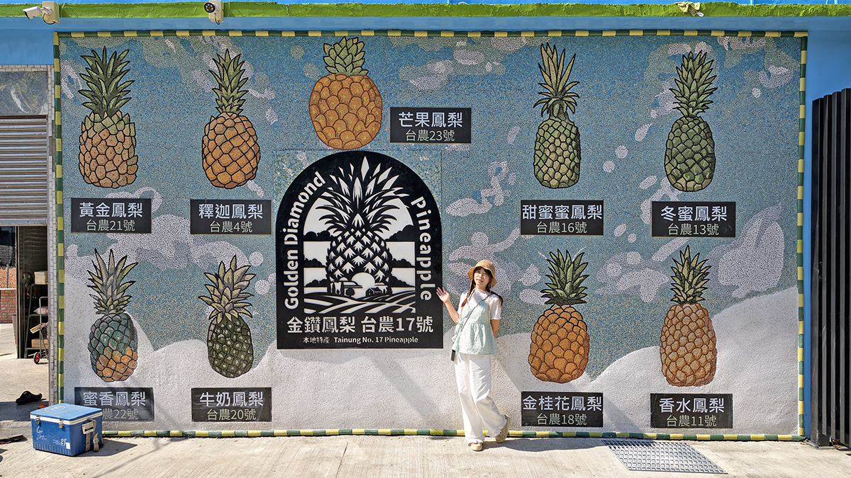 戶外的牆壁也有一處拍照打卡區,這裡集合了各品種的鳳梨的手繪圖,拍起來相當好看。