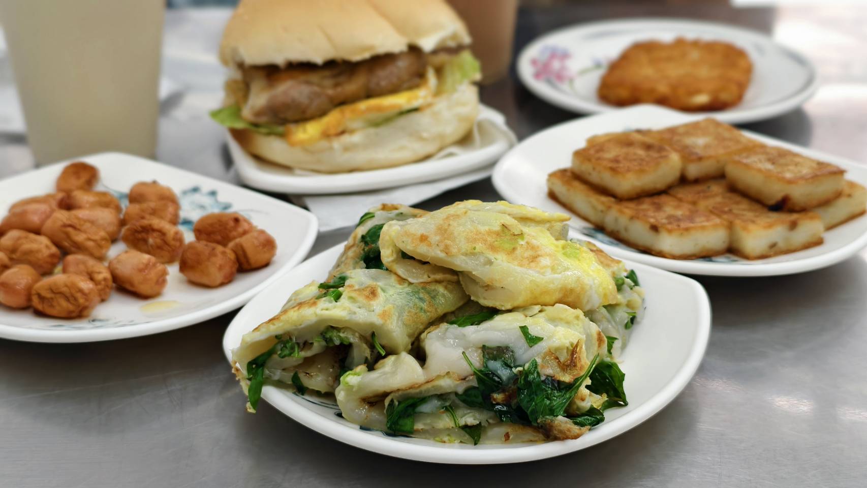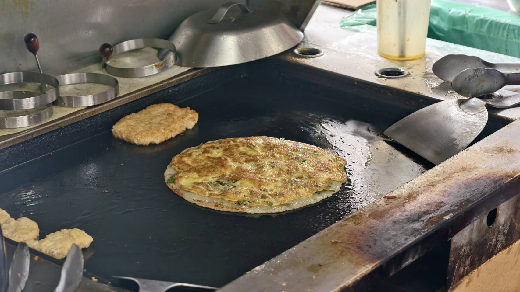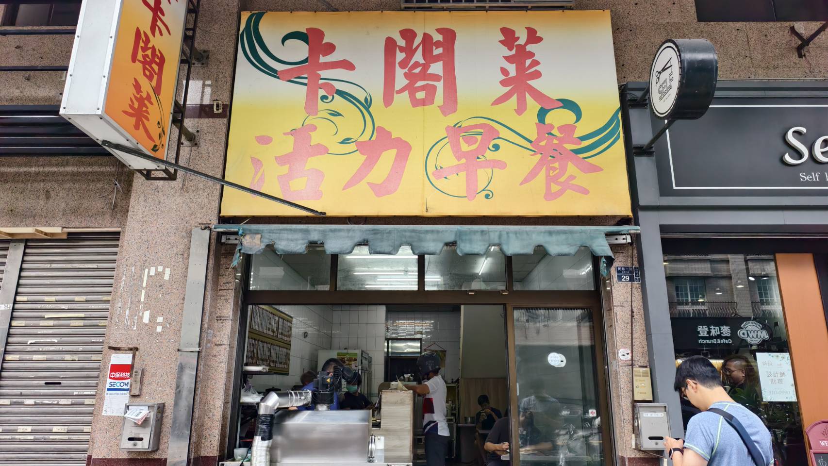今天起床的第一站,就是社區巷弄內的「卡閣萊活力早餐」,此時雖然已經接近中午,但店內外依舊滿滿人潮,我也上網查了評價,大家都推薦古早味蛋餅,那當然要點來試試。