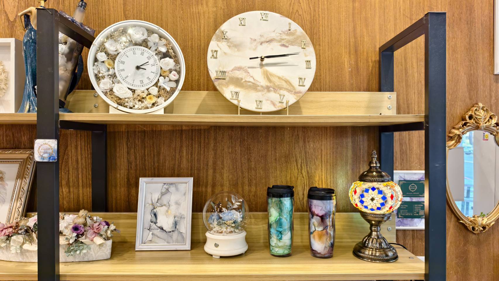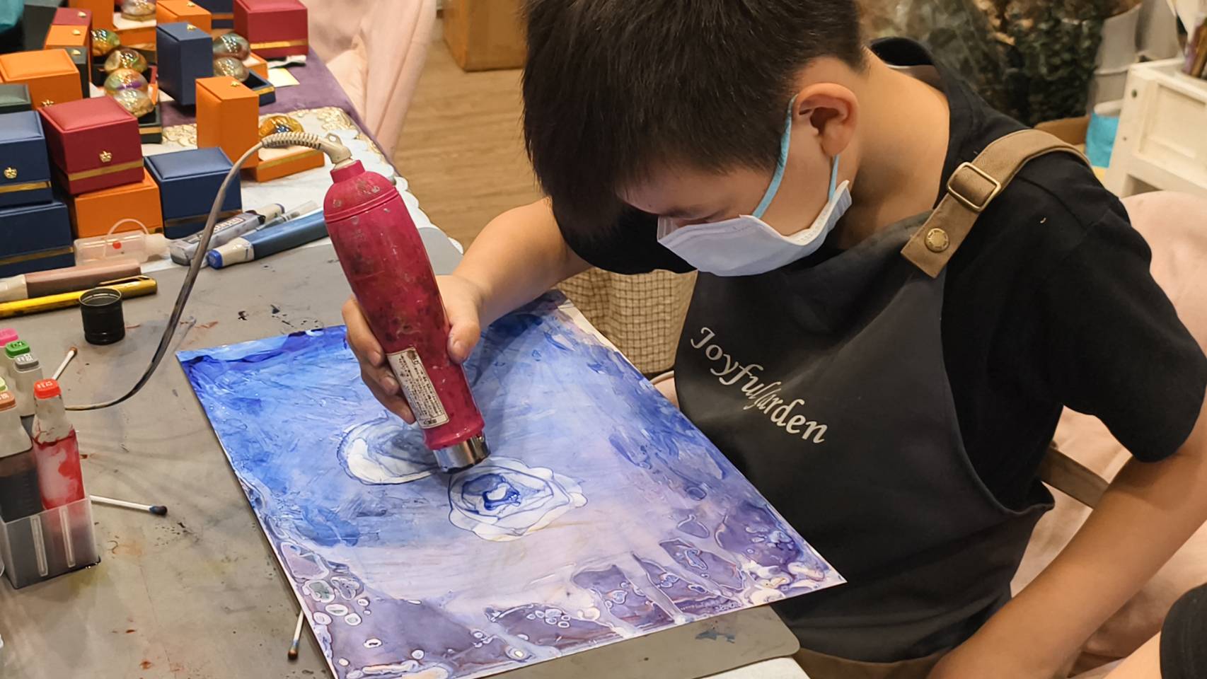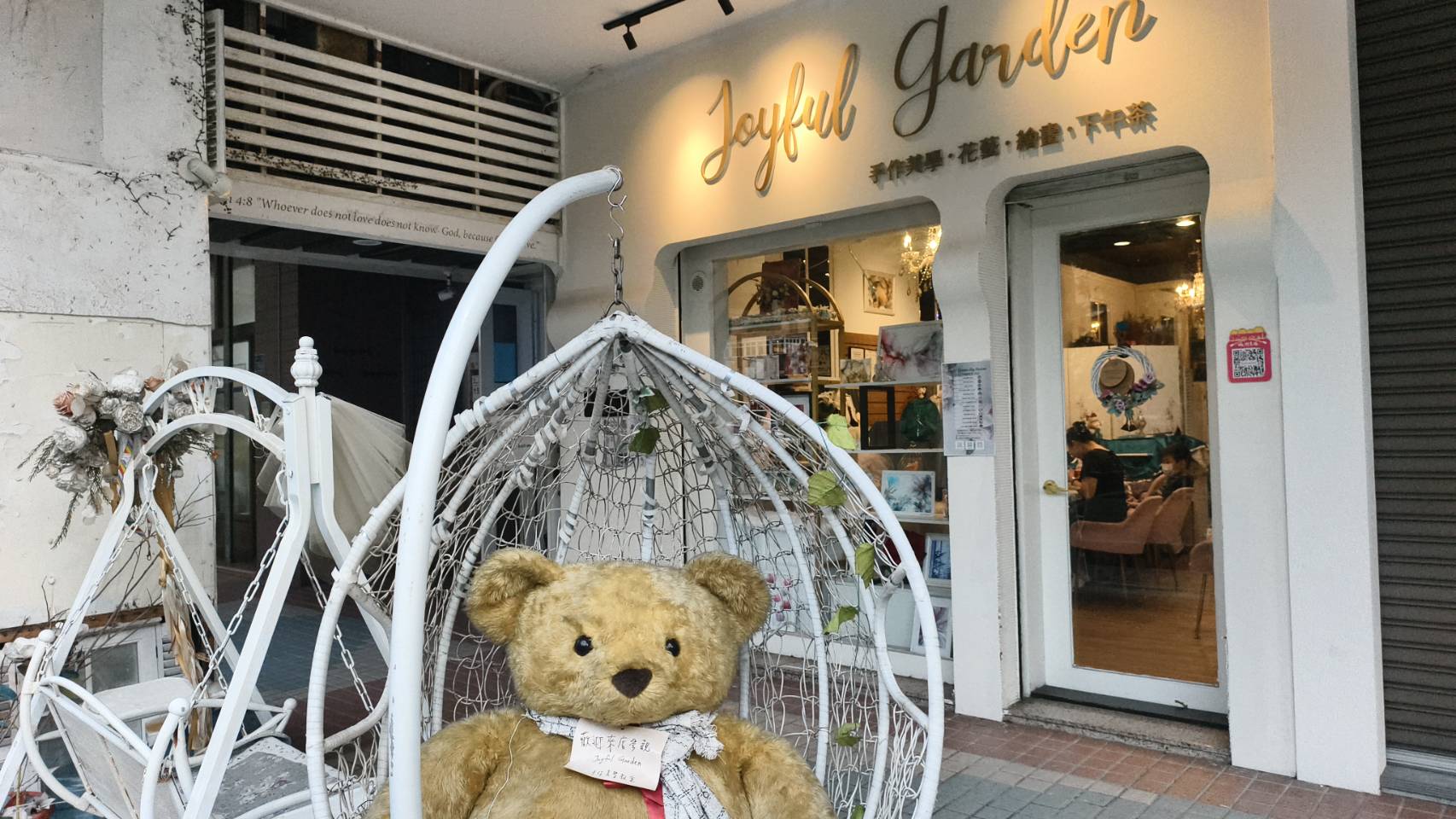 喝完奶茶,我們順著路散步到「Joyful Garden 手作美學」,光是門口的熊熊娃娃就讓人忍不住拍照打卡,店裡主打酒精墨水畫的體驗課程,主要的理念在把藝術融入日常用品,例如盤子、燈飾、杯子或時鐘等。