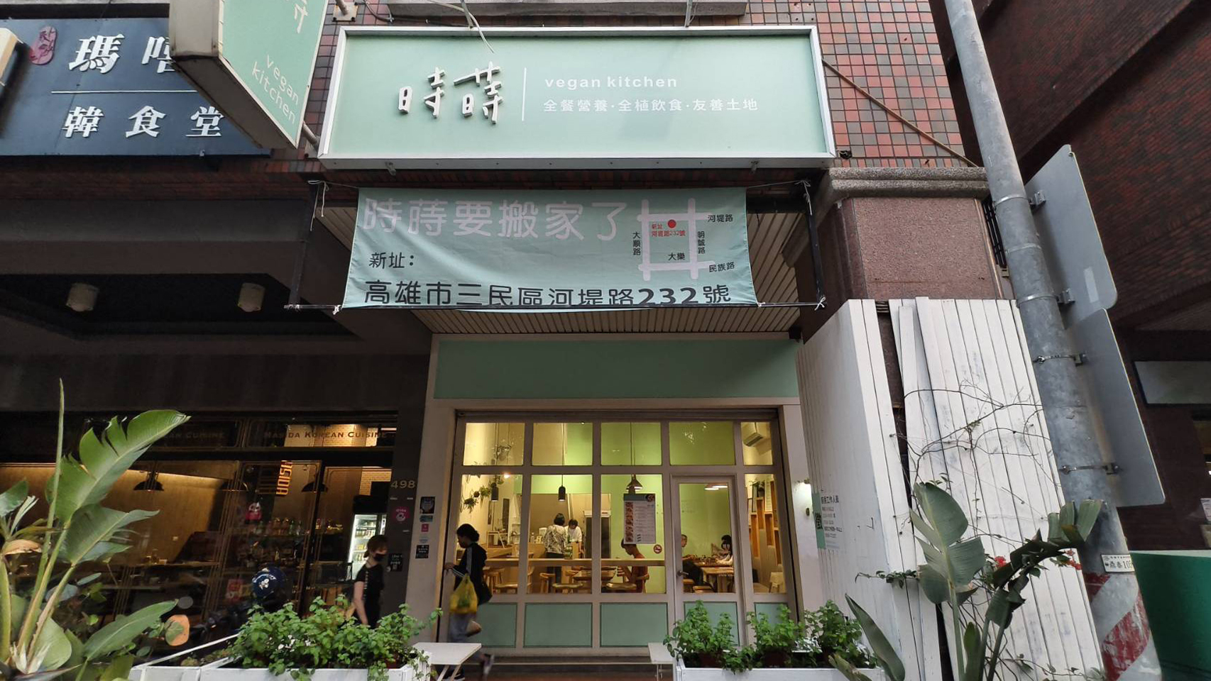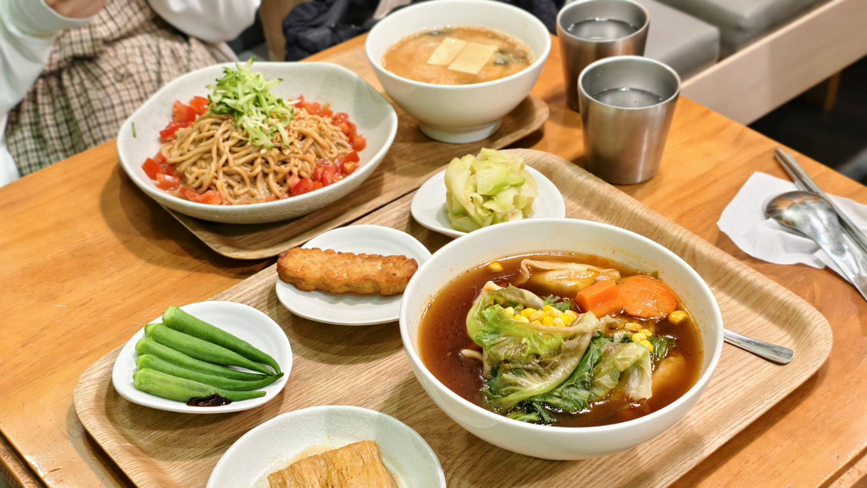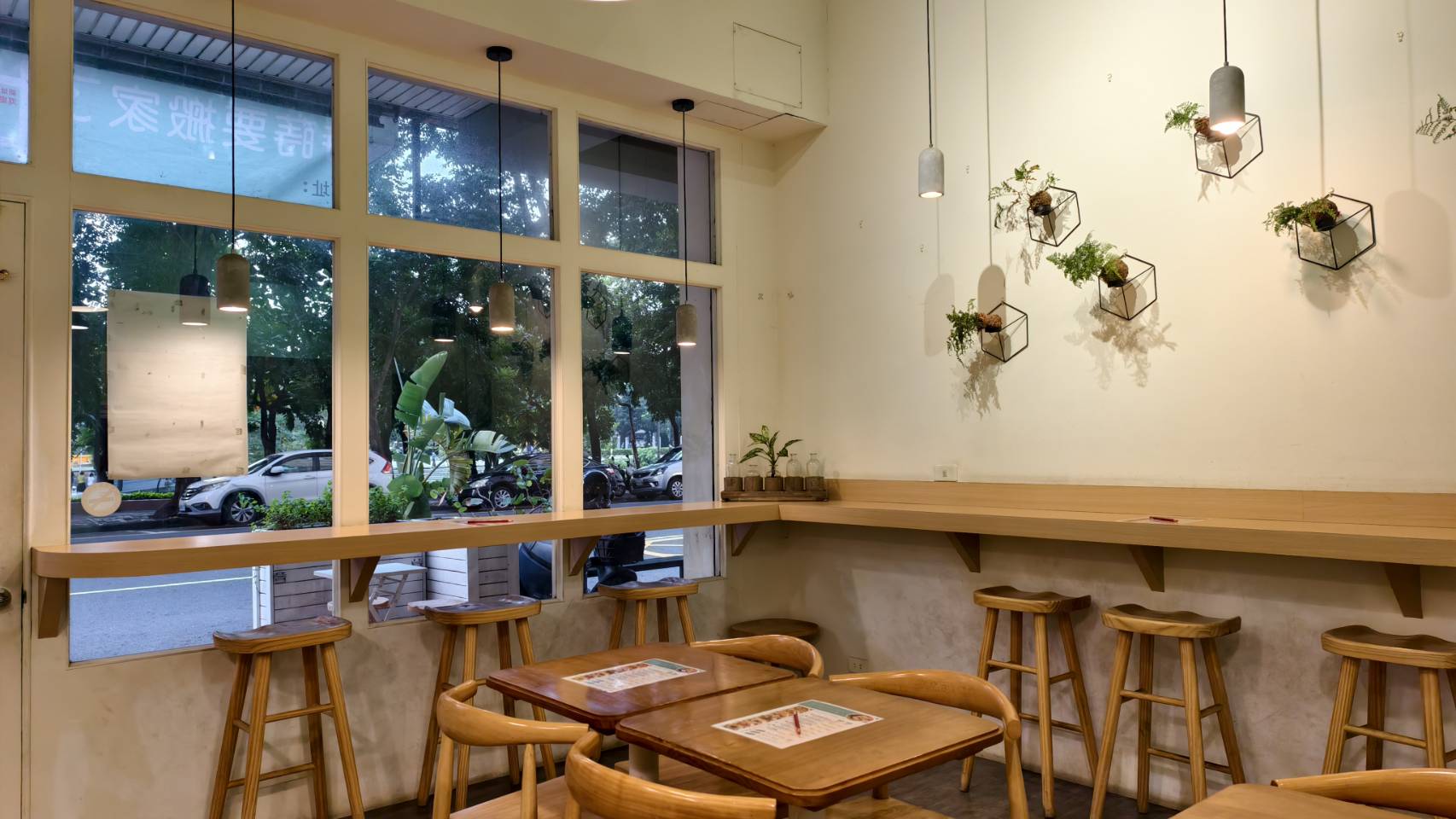 傍晚時分,我們在河堤公園對面的「時蒔 vegan 蔬食 麵館」品嚐晚餐,店內設計簡潔明亮,靠窗座位還能欣賞對面綠意,悠閒的風格非常愜意。