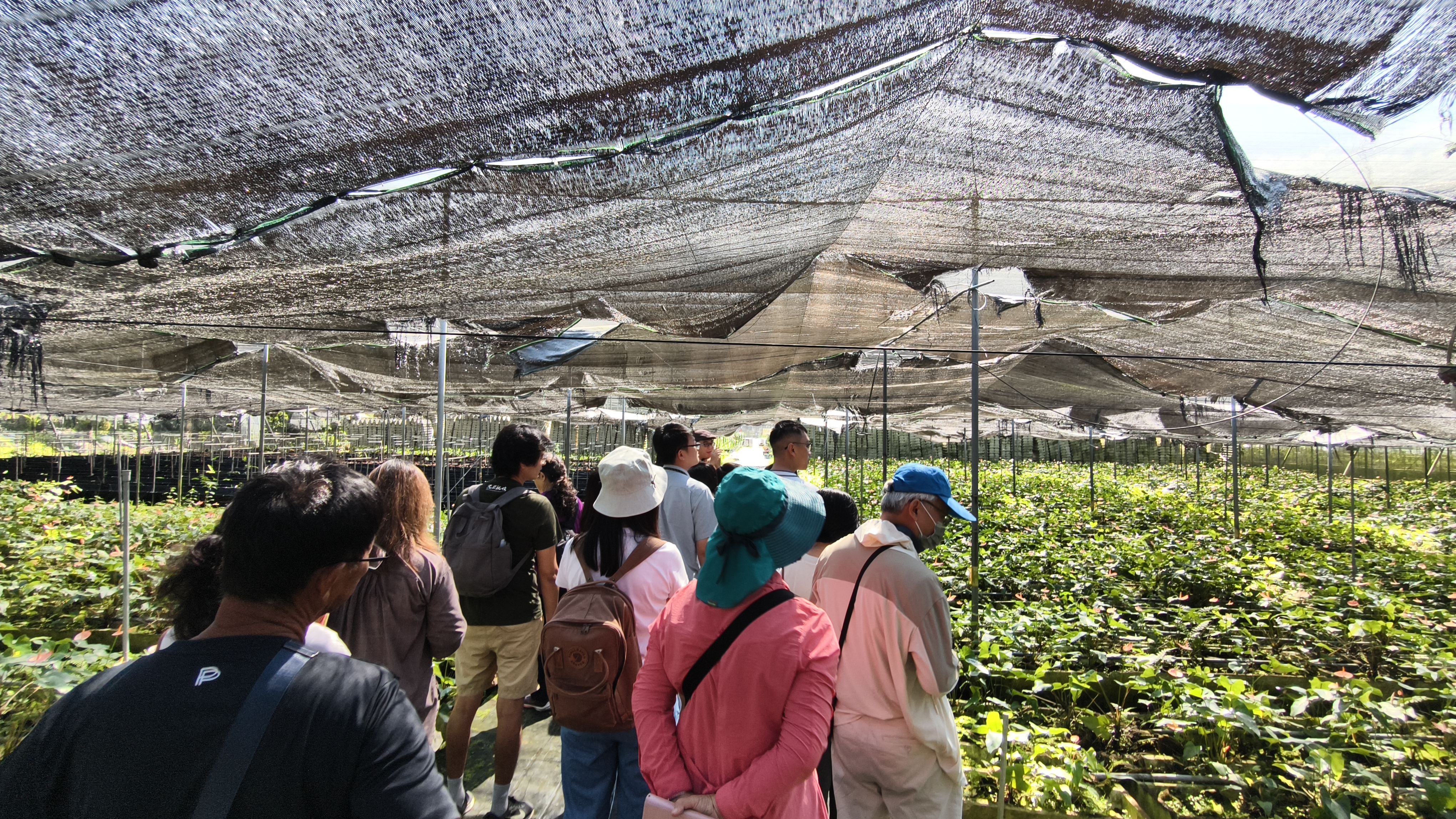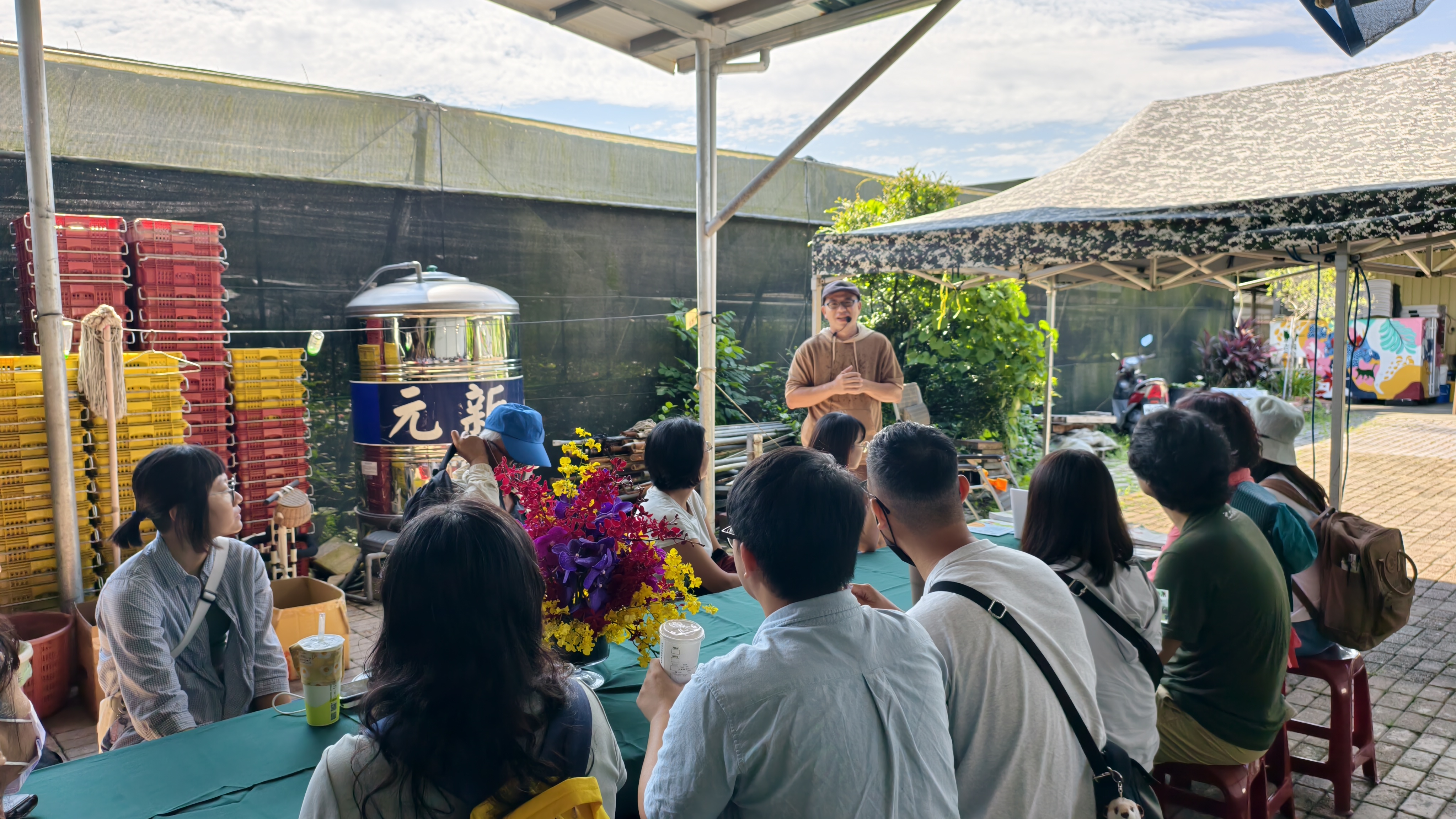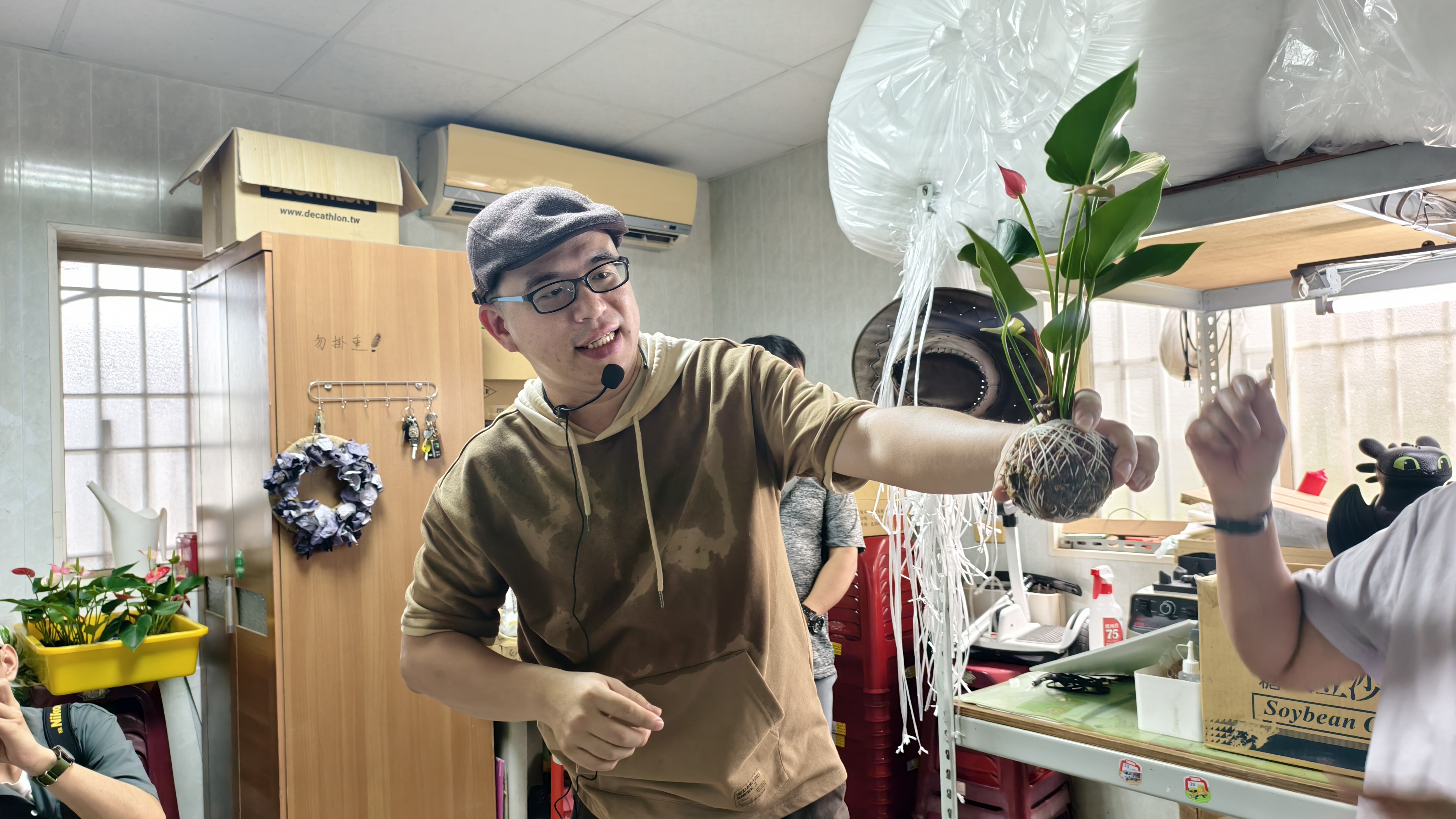 第一站我們來到「吉貓農園」,一走進去,型農丁群展就迎接著我們,一起先在亭子下講述返鄉種植火鶴花、萬代蘭、腎藥蘭與百香果的歷史緣由與心路歷程,之後便帶領我們走進繽紛花園,親身感受這片土地的生命力。