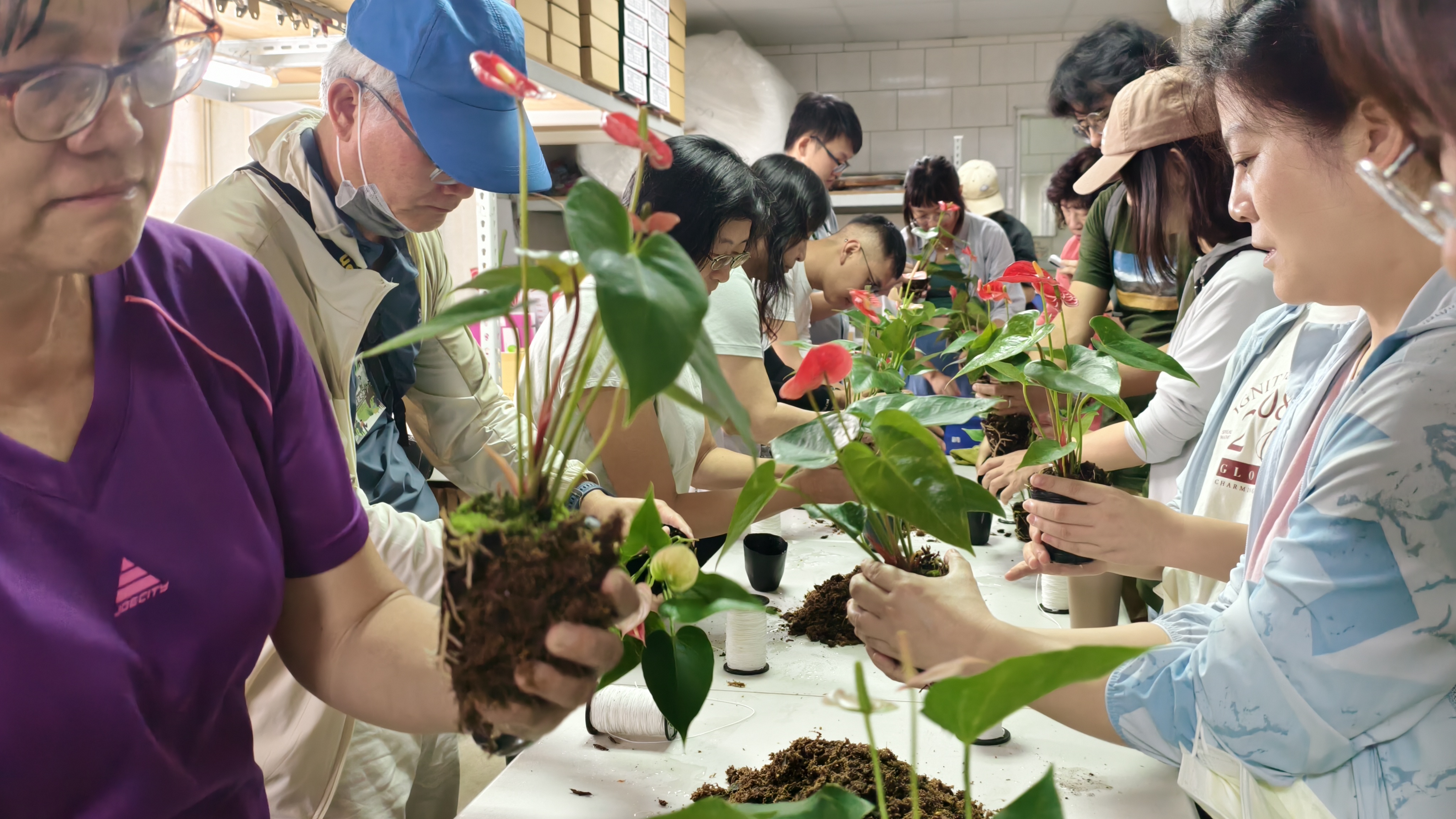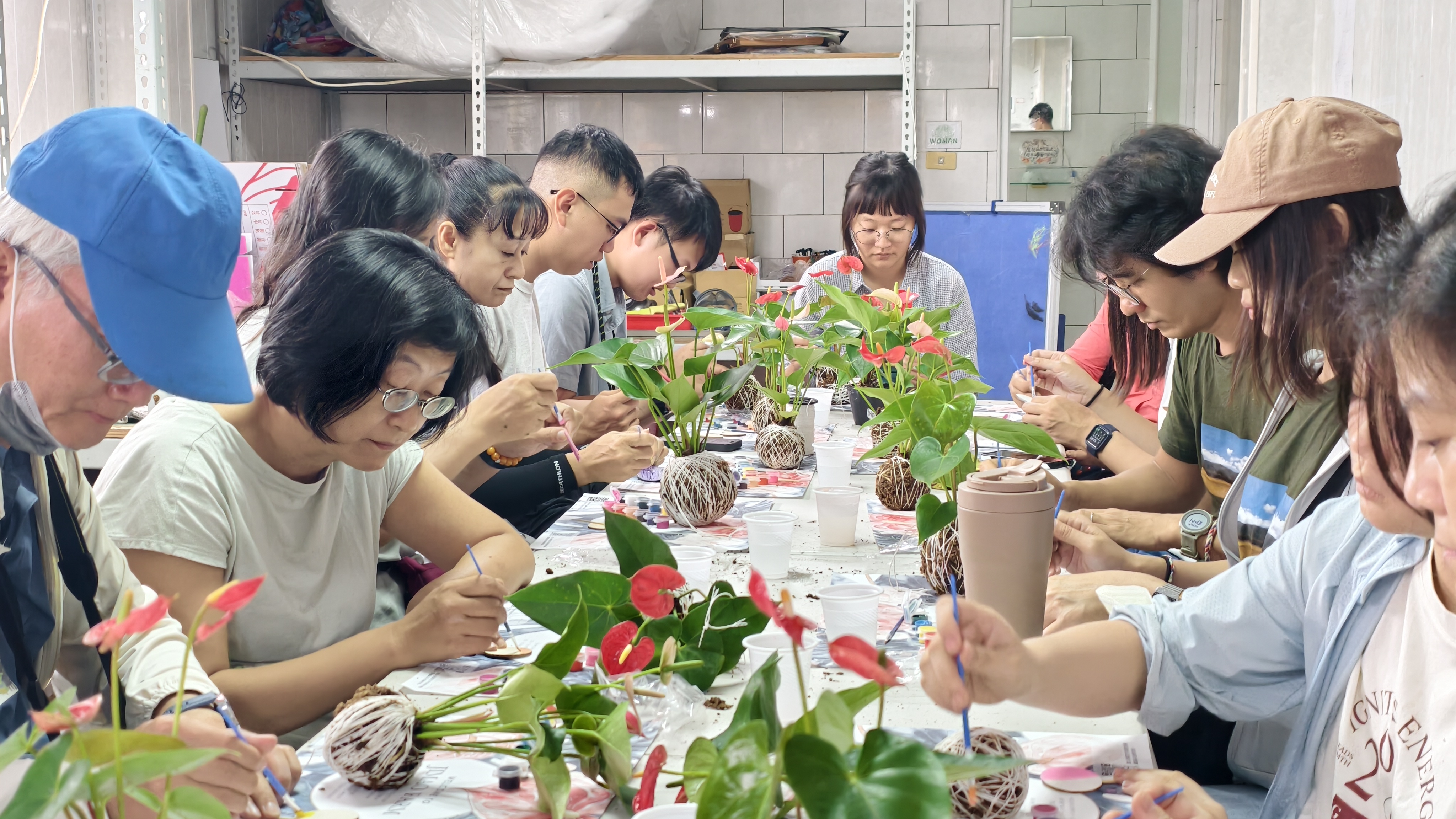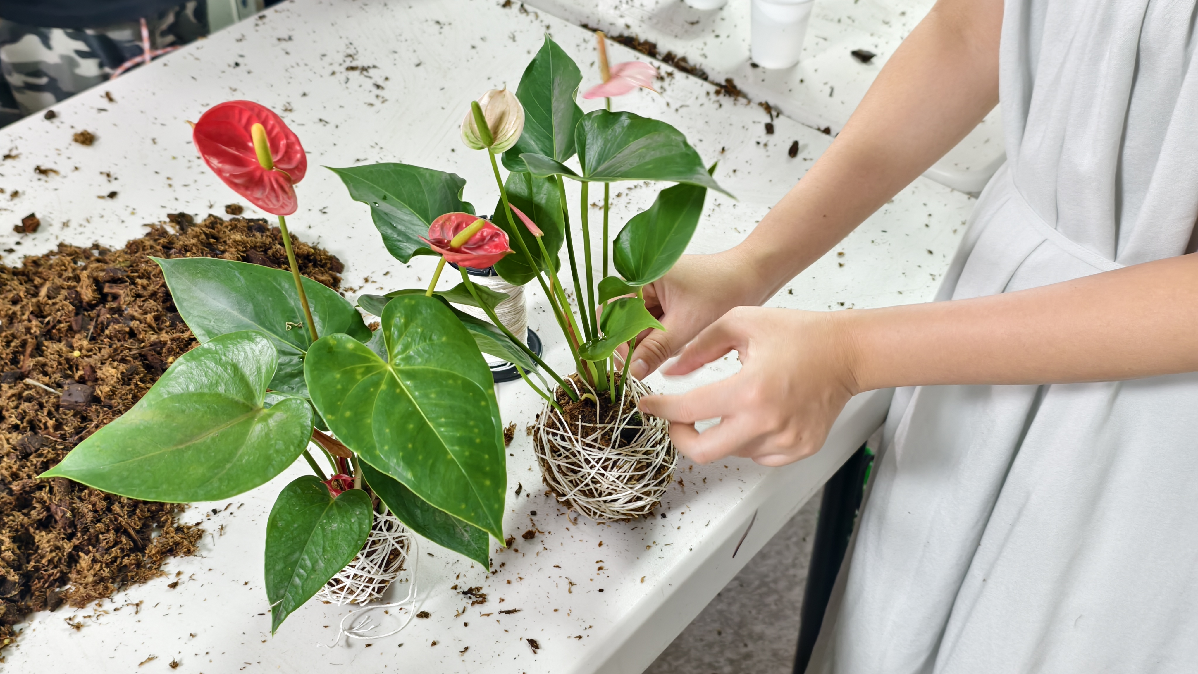 現場大家也迫不及待動手,紛紛投入製作屬於自己的火鶴花水苔球,專注的神情與笑聲交織,讓工坊裡洋溢著溫馨又熱鬧的氛圍。