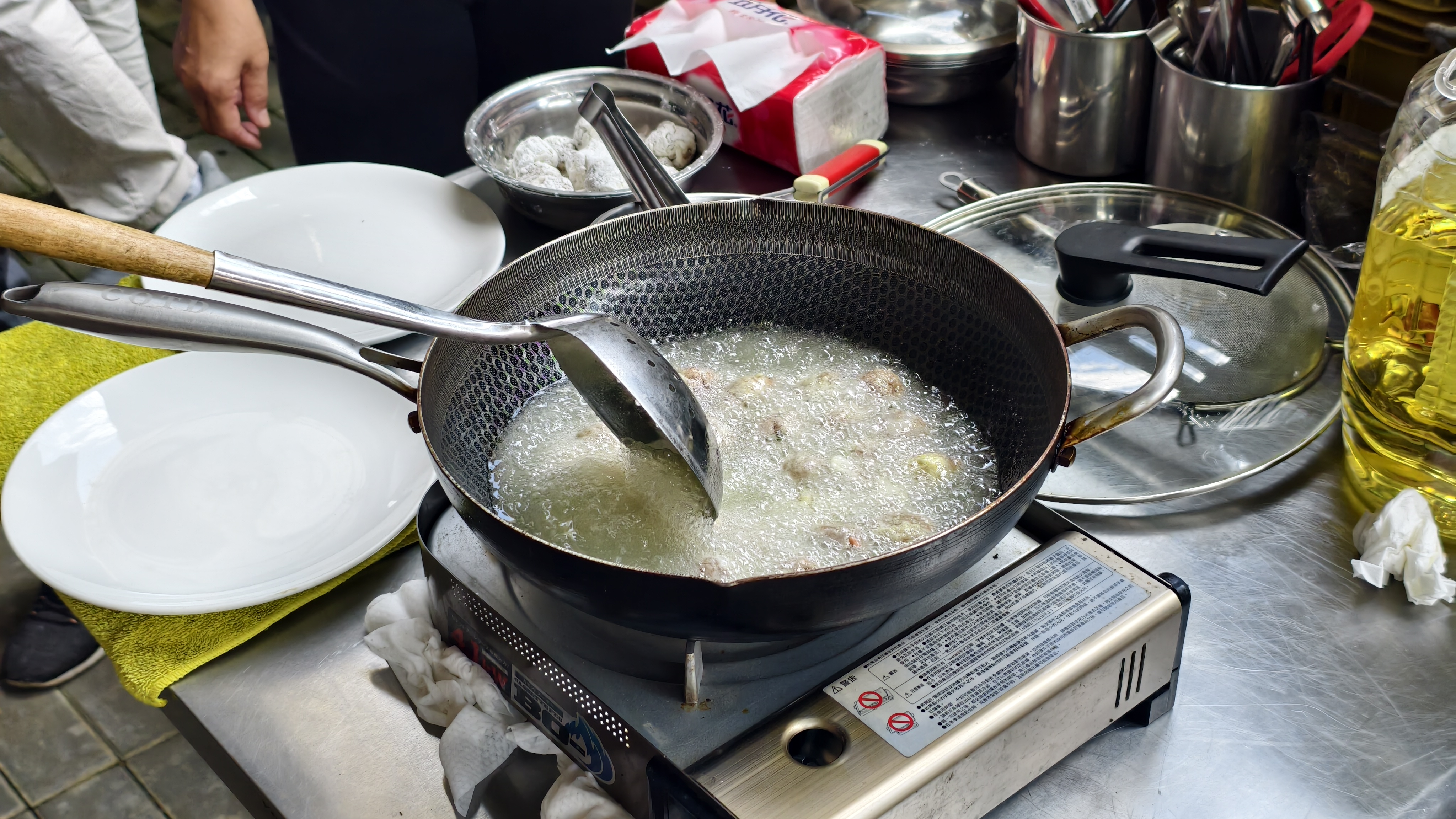 接著將八寶丸放入油鍋中炸至金黃,豬油受熱後香氣四溢,整個廚房瞬間瀰漫著誘人的氣味。