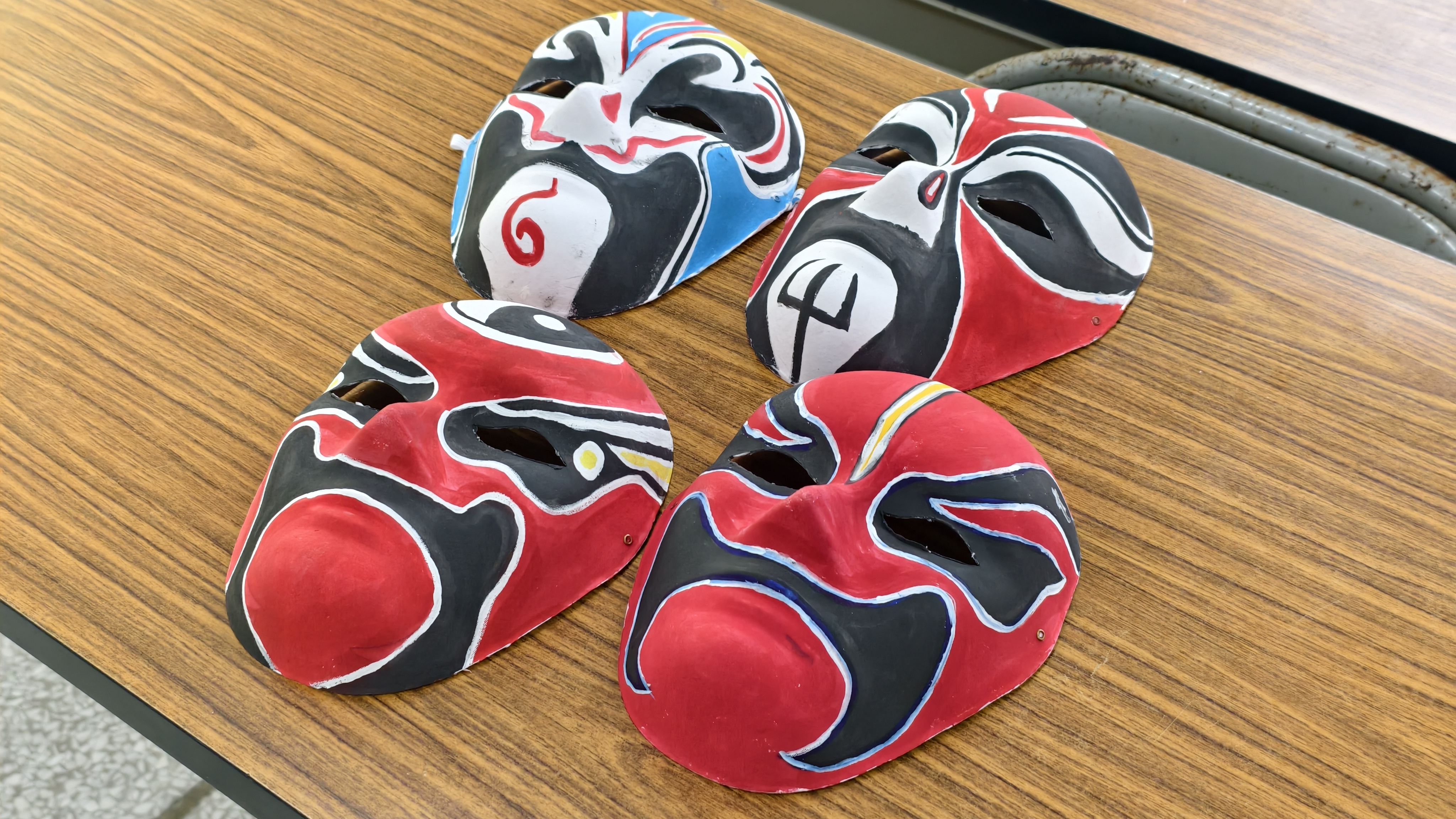 桌上陳列著各式宋江陣面具臉譜作品,色彩鮮明、風格多樣,成了大家創作時最好的靈感參考。